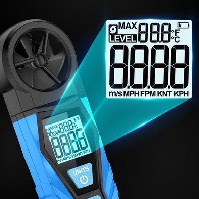 Ruční anemometr, LCD displej, nastavitelná snímací hlavice o 180°, měří rychlost, úroveň i teplotu větru, vhodné pro kontroly klimatizací, jachting, létání apod