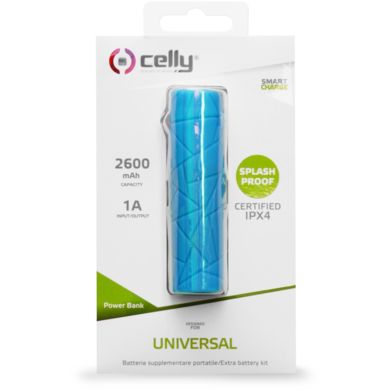 Univerzální lehká a voděodolná záložní baterie CELLY Powerbank s celkovou kapacitou 2600 mAh. Pogumovaný povrch chrání baterii před pískem, prachem a vodou ( certifikát IPX4 ). Díky kompaktní velikosti a minimální váze ji můžete mít stále s sebou.Se záložní baterií lze nabíjet zařízení jako jsou smarphony, tablety, MP3 přehrávače, GPS navigace, Bluetooth headsety, reproduktory a další. Baterie je vybavená microUSB kabelem, který umožňuje dobíjení baterie přes PC, notebook nebo USB nabíječku s maximálním výkonem 5V/1A.
