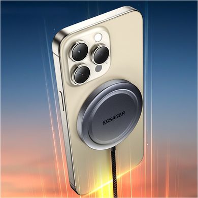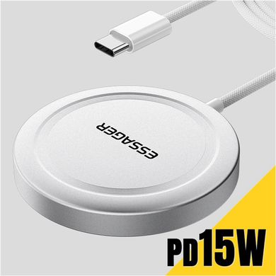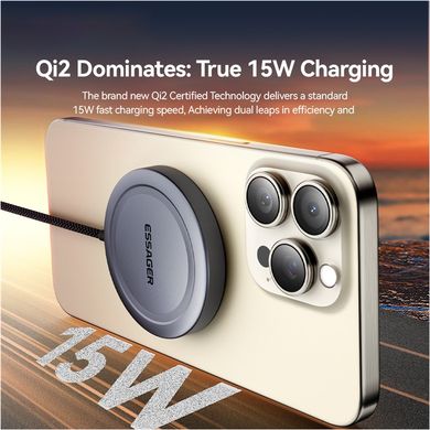 Magnetická Qi2 nabíječka Essager 15W s hliníkovým tělem. USB-C, automatická detekce, ochranné funkce, kompatibilní s iPhone 12+, 15×9×2cm, 94g.