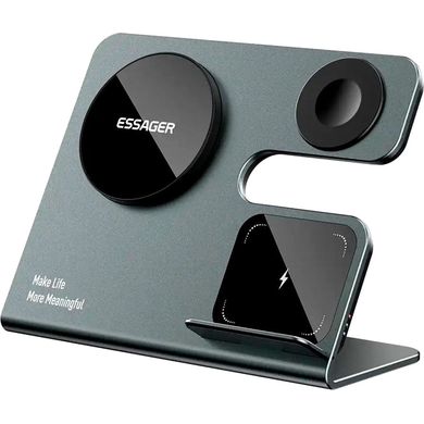 Bezdrátová nabíječka Essager OJD-119 3v1 pro telefon 15W, sluchátka 3W a hodinky 3W, QI standard, LED indikace, hliníková slitina, USB-C napájení.