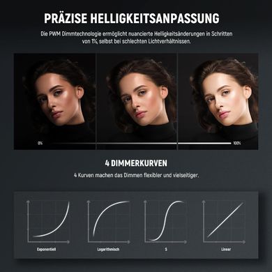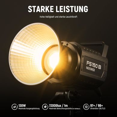 Trvalé studiové světlo NEEWER FS150B používá vysoce kvalitní a účinné COB LED diody pro výjimečný jas, 130W výkon bez blikání a maximální svítivost 72 000 luxů na vzdálenost 1 metr. Přenosný reflektor váží 1,7 kg a má rozměry 200×130×120 mm, dodává se s adaptérem pro stojan s náklonem 180° pro konfiguraci s volným úhlem. Díky těmto vlastnostem je ideální pro portrétní fotografie, rozhovory, nahrávání videí na YouTube/TikTok, filmování, živé vysílání a studiovou produkci. Díky technologii stmívání PWM lze úrovně jasu nastavit v rozmezí od 0 do 100 % v krocích po 1 %.