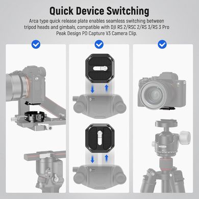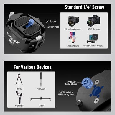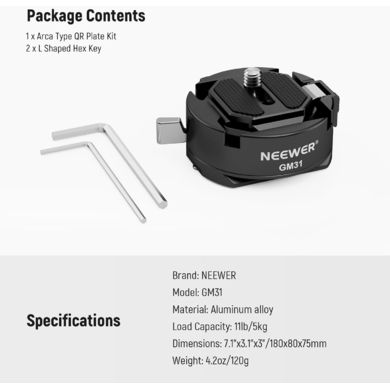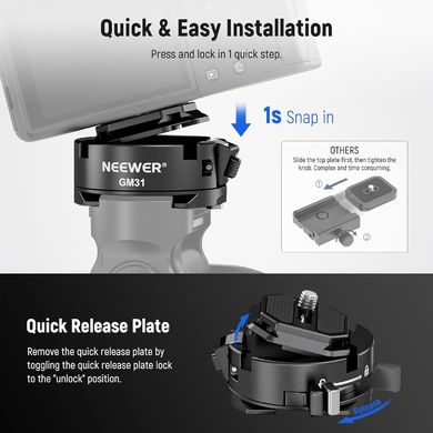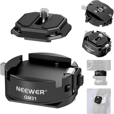 Neewer GM31 je sada rychloupínací destičky a patice pro stativ, kompatibilní se stativy Arca Swiss se systémem automatického zamykání. Čtvercová rychloupínací destička umožňuje pomocí přepínače odblokování bleskurychle přepínat mezi základnou upínače, stativovou hlavou typu Arca a klipem fotoaparátu. Čtvercový tvar umožňuje instalaci v jakékoli orientaci. Sada obsahuje 3/8" závit a adaptér 1/4" na 3/8" pro upevnění hlavice stativu na QR destičku gimbalových stabilizátorů, monopodů a sliderů. Díky tomu umožňuje plynulý přechod mezi fotografováním ze stativu a z ruky.