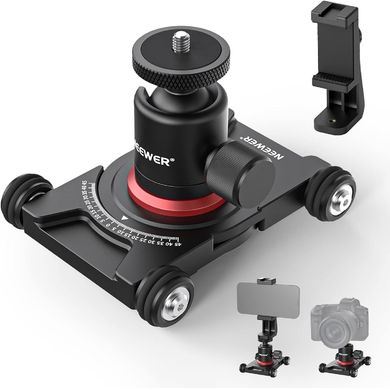 Neewer SD001 manuální „Dolly“ kamerový pojezd s naklápěcí otočnou kulovou upínací hlavou s 1/4" šroubem, elevace ±45°, rozvírací držák na telefon 5,5–9 cm