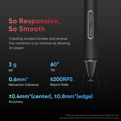 Skutečně realistické barvy umožní naplno rozvinout vaši kreativitu. A pokud pracujete v proměnlivých světelných podmínkách, jistě oceníte možnost plynule regulovat jas displeje až na hodnotu 250 cd/m². Unikátní je též dotykové pero X3 Pro Smart Chip Stylus. Nabízí bezkonkurenčních 16384 úrovní přítlaku a detekci náklonu až 60°, díky čemuž poskytuje přirozený pocit jako při kreslení na papír. Vysoká citlivost a přesnost pera umožňuje vytvářet jemné tahy a plynulé přechody již od nepatrného přítlaku 3 g. Špička pera je přitom vzdálena pouhých 0,6 mm od povrchu displeje, což eliminuje nežádoucí paralaxu a zajišťuje maximálně precizní kontrolu. Pero komunikuje s tabletem rychlostí až 200 snímků za sekundu, takže ani při dynamickém kreslení nezaznamenáte sebemenší prodlevu.