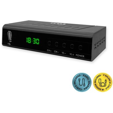 Set-top box pro nové digitální vysílání DVB-T2 H.265 (HEVC) i pro stávající DVB-T prostřednictvím klasické domovní či pokojové antény. Set-top box je možné umístit i za TV. Navíc balení obsahuje dvě dálkové ovládání, jedno klasické a jedno s velkými tlačítky, které je vhodné pro seniory.