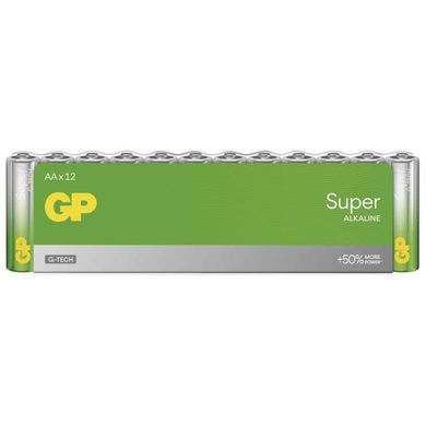 Alkalické baterie GP Super AA (LR6) v balení po 12 ks. Spolehlivý výkon, dlouhá životnost až 10 let, ideální pro dálkové ovladače, hračky a další zařízení.