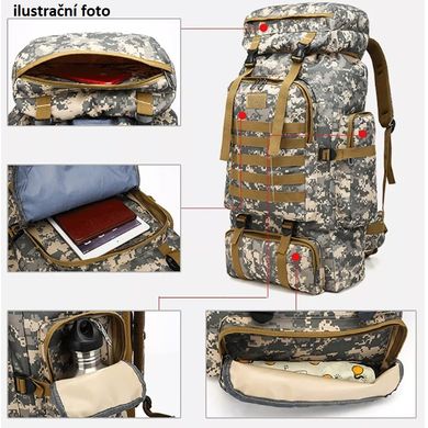 Army batoh, typ kletr, objem 80l, mnoho kapes a úložného prostoru, systém MOLLE pro připojení dalších kapes, bederní popruhy, voděodolný