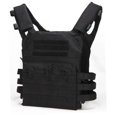 Taktická vesta v černé barvě, MOLLE systém, univerzální velikost, přední pouzdro na 2 zásobníky, hrudník a záda nosiči neprůstřelného plátu