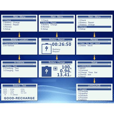 tester autobaterií s funkcí nabíječky a údržbou (obnovením) nepoužívaných baterií, 12V/24V, univerzální pro různé typy, přehledný a velký LCD