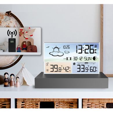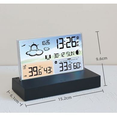 Domácí moderní bezrámečková meteostanice s venkovním čidlem, předpověď počasí na 12 hodin, hodiny, duální budík, kalendář, indikátor komfortu